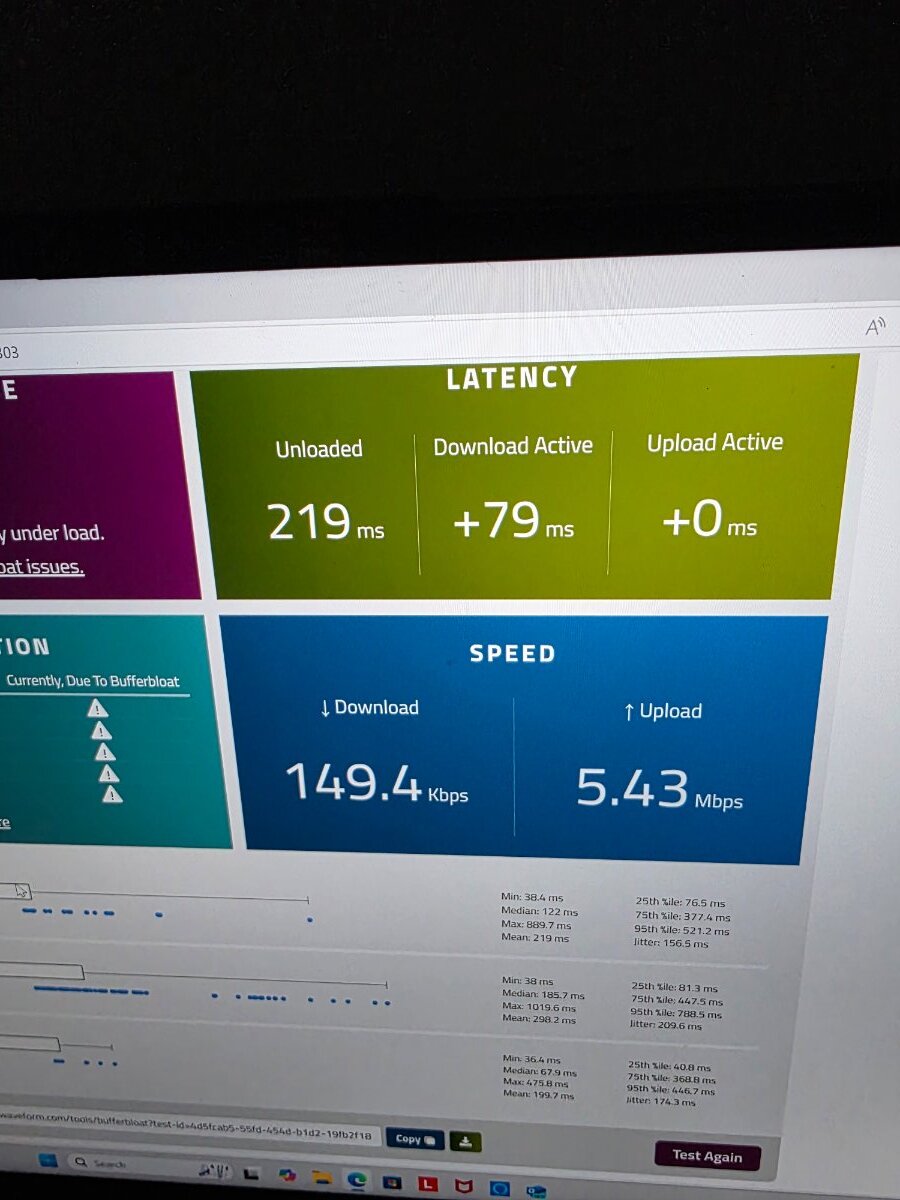 From the screenshot you have the speed for download set at 2Mbps. Also your unloaded ping is very high there, even on the other your unloaded was around 20 so it will only ever be able to be at 20ms minimum on loaded/active