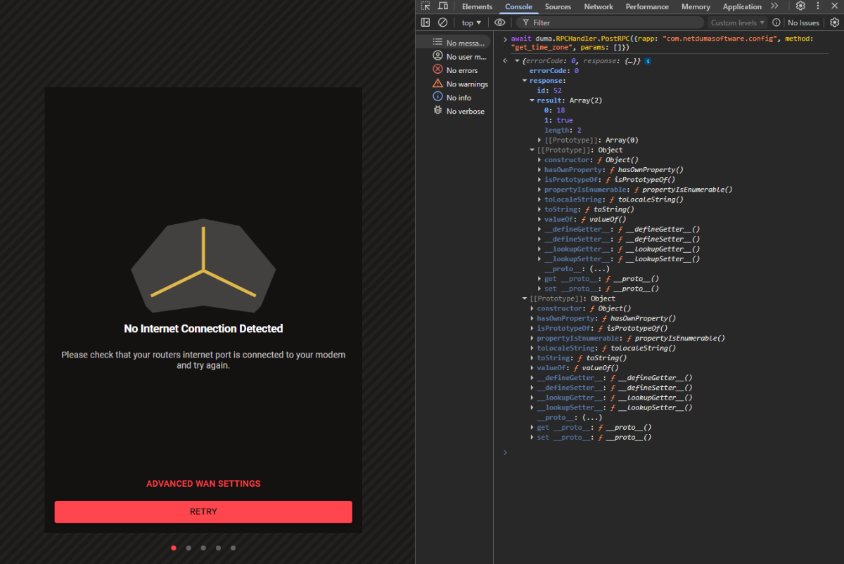 I tried the workaround you suggested, but unfortunately I am still unable to proceed with the setup. Here is exactly what I tested. After downgrading the router to firmware 4.0.41 and performing a factory reset, the router launches the initial setup wizard. The wizard requires a successful PPPoE connection before allowing me to continue. However, my ISP requires VLAN ID 2 for PPPoE to work. The setup wizard in this firmware does not provide any option to configure VLAN before attempting the PPPoE connection, so the connection cannot succeed. I also tried the command you suggested in the browser console: await duma.RPCHandler.PostRPC({rapp: "com.netdumasoftware.config", method: "get_time_zone", params: []}) The router returned a successful response (errorCode: 0), but the wizard did not skip and remained stuck on the same step. I then attempted several additional troubleshooting steps: Clearing browser storage and forcing redirection to the dashboard via the developer console Trying to directly access internal pages such as /#/dashboard and /#/settings/internet Disconnecting the WAN cable and attempting to skip the internet setup step Connecting a temporary DHCP internet source to allow the wizard to complete Unfortunately, none of these methods allowed me to bypass the setup wizard or reach the main DumaOS interface. So at the moment I am blocked on the setup screen and cannot configure: PPPoE VLAN ID 2 which are required for my fiber connection. For reference, my setup is: Fiber connection ONT: Nokia G-240G-E PPPoE authentication Required VLAN ID: 2 Could you please advise on how to bypass the setup wizard or access the full configuration interface directly, so that I can manually configure PPPoE and VLAN? We are getting close to solving this puzzle, so I am confident we will get there 🙂 Thank you for your help. 192.168.77.1-1773378052314.log