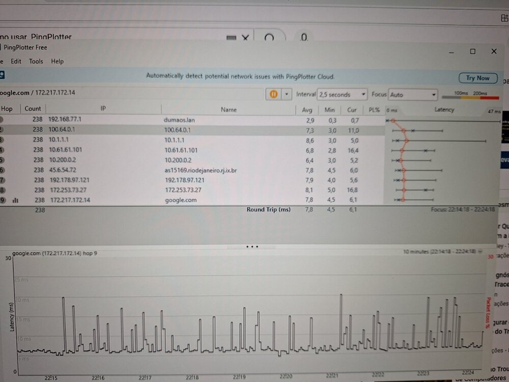 Coloquei o site google.com e apertei o enterro no PingPlotter Free -
