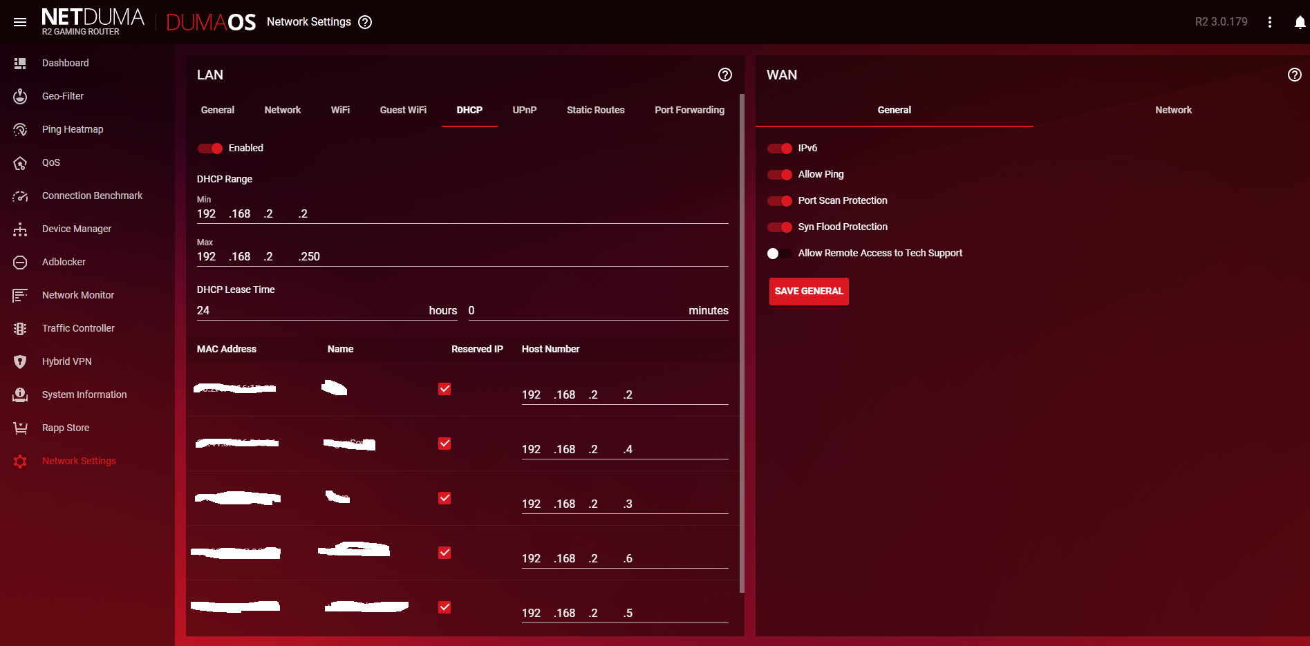 Netduma Liam Posted February 26, 2021 Author Posted February 26, 2021 @SETi-D Sorry to hear this, I can understand how frustrating it must be. If you didn't already, could you please put the R2s WAN IP in the DMZ of the upstream modem/router. Could you also go to Network Settings -> LAN -> DHCP and set the lease time to 168 hours? Failing that you could always go back to the .179 update if that was more stable for you. @yoguzturk Welcome to the forum! What are you seeing when you click 'Save network settings', are you getting the warning message asking you to confirm the changes?