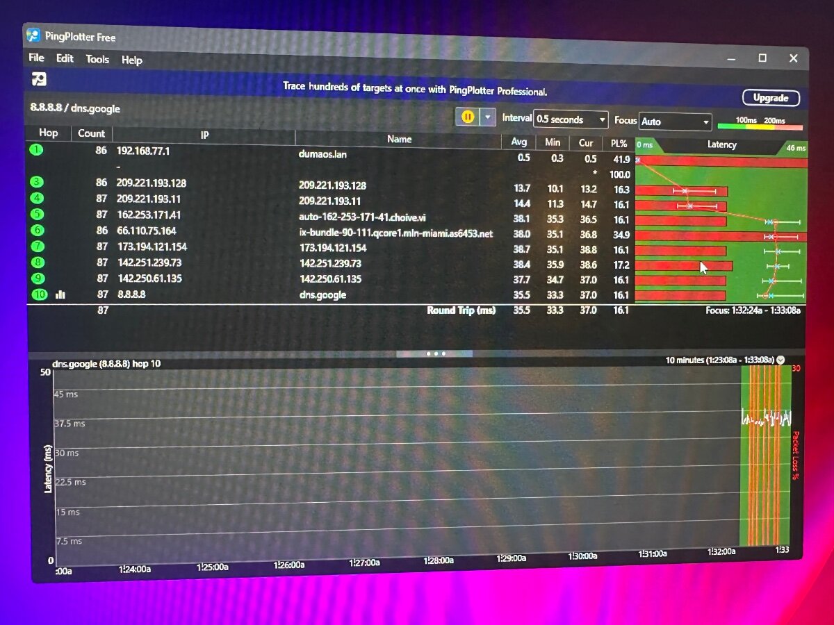 Ceez Posted 2 minutes ago Author Posted 2 minutes ago I tried 1.1.1.1 still has packet loss I tried ping plotter dns still the same. I’ll post them all in about an hour. The issue is coming from netduma r3 because any other router I use no packet loss
