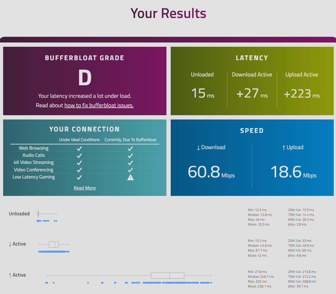 NetDumaR2User Posted 3 hours ago Author Posted 3 hours ago Thank you. I haven't tried gaming yet so not experienced any spikes. I used auto-setup on the QOS and enabled it as Always. It put download to 62% and upload to 100% I ran a Bufferbloat test and it came back grade D. I adjusted the download and upload to 60% each and got the same results on the test. Previously when using the PPPoE settings with the Draytek and same QOS settings I got grade A on the bufferbloat test (when the R2 was stable initially). Any ideas why it would have reduced to D, and if this means QOS isn't working correctly?